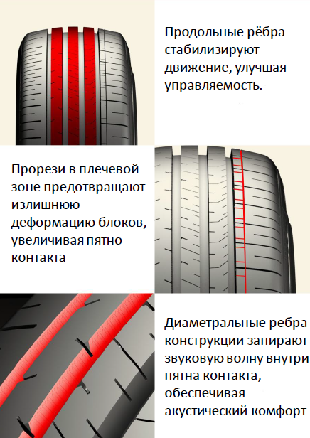 Протектор покрышки обладает асимметричной конструкцией, что обеспечивает улучшенные характеристики при движении как по сухой, так и по мокрой дороге. Его центральная часть состоит из более жестких блоков, которые повышают устойчивость на прямых участках дороги, в то время как боковые элементы помогают шине обеспечивать лучшее сцепление при маневрировании.