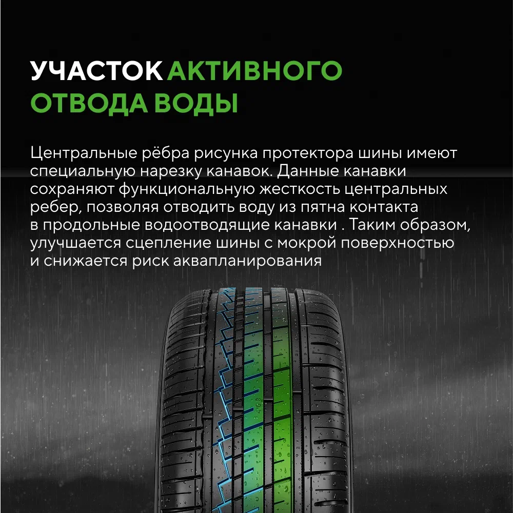 - Эффективная защита от аквапланирования благодаря инновационной конструкции шашек протектора, расположенных на внутренней плечевой зоне. Такая форма позволяет эффективно направлять поток воды в поперечные канавки, ускоряя его отведение при интенсивных осадках.