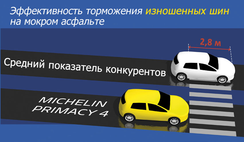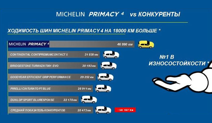 При этом, если говорить о сравнении с основными конкурентами производства Pirelli, Goodyear и Bridgestone, комплект Primacy 4 в среднем прослужит на один год дольше.