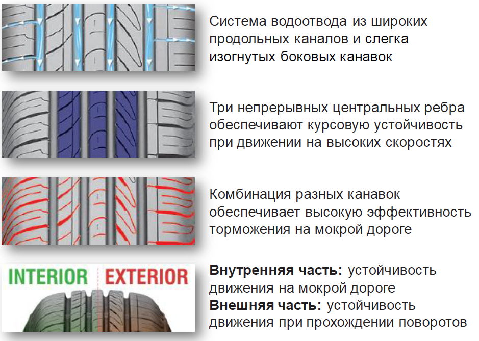 - Три массивных продольных ребра в центральной части протектора повышают жесткость конструкции. Это обеспечивает устойчивость автомобиля при движении по прямой и точную реакцию на рулевое управление.